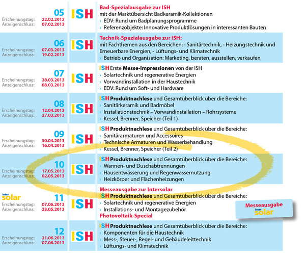 Nur in der SBZ finden Sie die ISH-Neuheiten so kompakt, umfassend und nach den einzelnen Produktbereichen sortiert. Damit Sie auch wissen, welche Themenbereiche wir in welchen Ausgaben behandeln, die nachfolgende Übersicht. Es lohnt sich also einmal mehr, keine SBZ-Ausgabe zu verpassen!