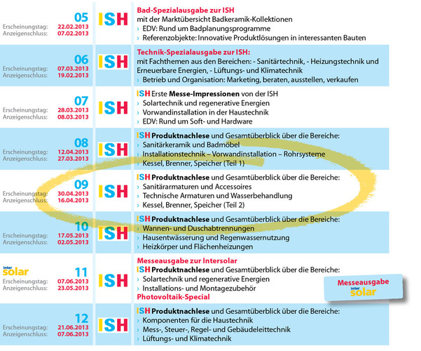 Nur in der SBZ finden Sie die ISH-Neuheiten so kompakt, umfassend und nach den einzelnen Produktbereichen sortiert. Damit Sie auch wissen, welche Themenbereiche wir in welchen Ausgaben behandeln, die nachfolgende Übersicht. Es lohnt sich also einmal mehr, keine SBZ-Ausgabe zu verpassen!