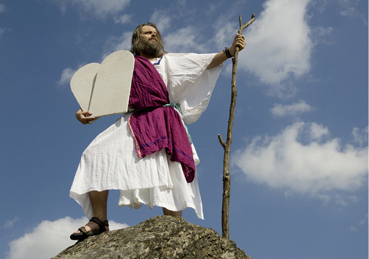 Moses kommt zum zweiten Mal mit den Gesetzestafeln vom Berg Sinai herab, um dem Volk, das unten geduldig auf ihn wartet, die Gebote Gottes zu verkünden. Bei den Wartenden angekommen, sagt er: „Also, Leute, es gibt eine gute und eine schlechte Nachricht. Welche wollt ihr zuerst hören?“
