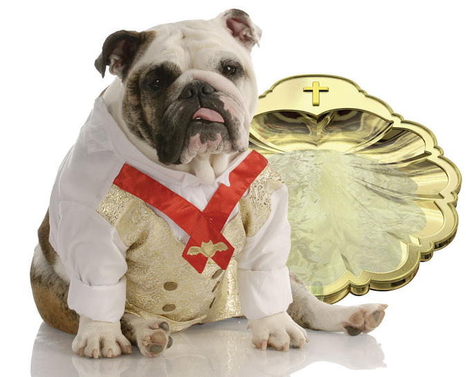 Ein Mann kommt zum Pfarrer und möchte seinen Hund taufen lassen. Der Pfarrer: „Das ist unmöglich!“ Darauf der Hundebesitzer: „Der Hund ist wie ein Familienmitglied und ich lege auch 1000 Euro in den Klingelbeutel.“ Der Pfarrer lenkt ein: „Na gut, aber nur wenn sie es für sich behalten.“ Der Hund wird getauft, aber der Hundebesitzer erzählt es stolz im ganzen Ort – so erfährt es auch der Bischof. Der lässt den Pfarrer kommen: „Ja, sind Sie denn wahnsinnig, einen Hund zu taufen?“ Pfarrer: „Der Mann hat 1000 Euro in den Klingelbeutel getan.“ Darauf der Bischof: „Und wann ist die Firmung?“