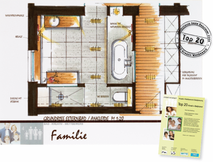 Anja Kießling entschied sich gegen die Platzierung des Badezimmers im neuen Anbau und krempelte die zwei Etagen des Doppelhauses komplett um. Mit der räumlichen Zweiteilung der Familie gelang der Badplanerin die Quadratur des Kreises. Die Kinder erhalten ein eigenes Badezimmer, und das Badezimmer der Eltern wird in der Mitte des Hauses integriert.