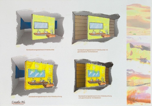 „Ziel der Gestaltung – neben dem Komfort mit viel Bewegungsfreiheit – war es, ein Ambiente zu schaffen, dass den Urlaub nach Hause holt“, so der Badeinrichter Christan Lerch, der in Lüneburg ein SHK-Traditionsunternehmen in dritter Generation führt. „Alle verwendeten Materialien, deren Optik und Haptik, sind auf dieses Erlebnis abgestimmt. So findet man am Bodes des Bades Feinsteinzeug von Cotto d’Este, welches mit seiner unebenen Oberfläche und hellen Sandtönen der Natur sehr nahe kommt“, ergänzt die Innenarchitektin Nicola Stammer. Die Wanneneinfassung, der Duschbereich und der Raumteiler sind mit Sandsedimentgestein belegt. Dieses neue Material (Novodune), welches von Sanddünen abgebaut wird, ist nur 3 mm stark und somit lichtdurchlässig. Der Raumteiler, der den Waschtisch trägt und die Schiebetüren aufnimmt, ist aus einer stabilen Acrylglasscheibe, welche mit diesem Material versehen ist und hinterleuchtet werden kann. So kommen die Strukturen des Sandsedimentgesteins besonders gut zur Geltung. Der Waschplatz ist schlicht und klar; die 15 cm starke Platte integriert zwei Schubläden, gänzlich ohne Griffe, die lediglich durch eine „push open“- Funktion zu öffnen und zu schließen sind. Zwei Waschschalen unterbrechen reizvoll die sonst so funktionale Gestaltung. Berührungslose Armaturen (Emote, Dornbracht) sollen Wasserflecken vermeiden helfen. Der große Spiegel verfügt über einen integrierten Plasmabildschirm – so verpasst der TV-Anhänger selbst beim gemütlichen Baden keine seiner Lieblingssendungen. Der Regenhimmel (Rainsky, Dornbracht) lässt jeden Morgen den Tag vitalisierend beginnen. Die bodengleiche, 160cm lange Duschwanne (Floor, Bette) wird durch die zusätzlich vorgesetzte Duschrinne auf eine Tiefe von 100cm komfortabel vergrößert. Die zusätzliche Ablaufrinne, die am Eingang der Dusche installiert ist, hilft größere Wassermengen in der Dusche zu bewältigen. Die Transparenz bei der Realisierung der Duschabtrennung und im Eingangsbereich sollen den großzügigen Charakter unterstreichen.
