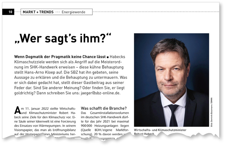 Habecks Klimaschutzziele werden sich als Angriff auf die Meisterordnung im SHK-Handwerk erweisen – diese kühne Behauptung hat Hans-Arno Kloep in der SBZ-Ausgabe Nr. 2-2022 aufgestellt (ab Seite 10). In einem längeren Kommentar erläuterte er seine Aussage und untermauerte die Behauptung. SBZ-Leser haben ihre Ansichten zu seinen Ausführungen geäußert.