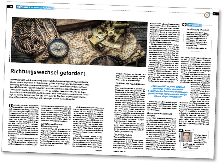 Der Beitrag „Richtungswechsel gefordert“ in der SBZ 22-2017 (Seite 40) hat eine Menge Reaktionen aus unserer Leserschaft hervorgerufen. Die Aussage dazu war: Innovationswahn und Greenwashing in der Heizungsindustrie müssen ein Ende haben. Dazu wurden folgende Fragen aufgeworfen von Hans-Peter Sproten, Hauptgeschäftsführer des Fachverbandes SHK Nordrhein-Westfalen: Hat die Heizungsindustrie eine zu hohe Schlagzahl in der Entwicklung „grüner“ Produkte? Sind die Neuheiten zu sehr dem Diktat der Effizienz unterworfen? Seine Meinung zu diesem Thema liefert streitbare Argumente. Die SBZ stellt dafür die Plattform dar, wir freuen uns über weitere Zuschriften, die Ihre Erfahrungen und Meinungen zu dem Thema darstellen.
