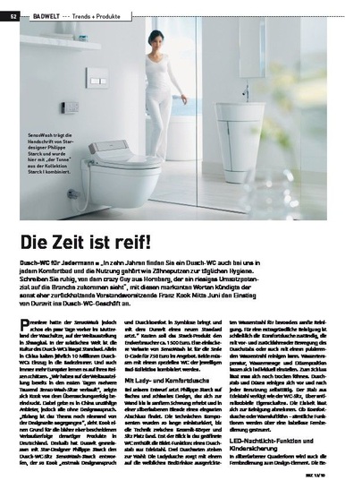 Hocherfreut habe ich den Artikel über das Duravit Dusch-WC in der SBZ gelesen. Auch ich bin der Meinung, dass die Zeit für ein Hygiene-WC mehr als reif ist. Während in Asien, das wir ja gerne immer noch etwas belächeln und in vielen Dingen als rückständig ansehen, Hygiene am „stillen Örtchen“ etwas Selbstverständliches ist, haben wir aufgeklärten Europäer hier echten Nachholbedarf! Für die wenigen Interessierten gab es leider bisher nur optisch wenig anspruchsvolle und relativ teure Lösungen. Der Vorstoß von Duravit, das Thema Wasch-WC mit dem Designanspruch von Philippe Starck zu vereinen – und das alles noch zu einem marktgerechten Preis verdient Beifall! Es bleibt zu hoffen, dass dieses Produkt sowohl vom Handel als auch vom Fachhandwerk angenommen und forciert wird. Der Markt ist zweifellos vorhanden und wartet auf entsprechendes Engagement von Industrie, Handel und Fachhandwerk. Die Zeit ist reif! – Ich freue mich auf ein neues innovatives Produkt für unsere Branche.