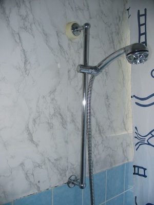 Neulich kam mir eine Installation unter, die vor lauter Bastelarbeiten nur so strotzt. Allein im Bad gab es viel zu entdecken. Zum Beispiel die Wannenarmatur, an der zwei separat absperrbare Handbrausen angeschlossen waren (eine Anregung an die Armaturenhersteller?). Eine davon thronte dauerhaft an einer Brausestange. Da die Stange unten teilweise noch auf Fliesen montiert war, hatte sie oben einen zu großen Wandabstand. Aber auch das ist für einen echten Bastler überhaupt kein Problem!