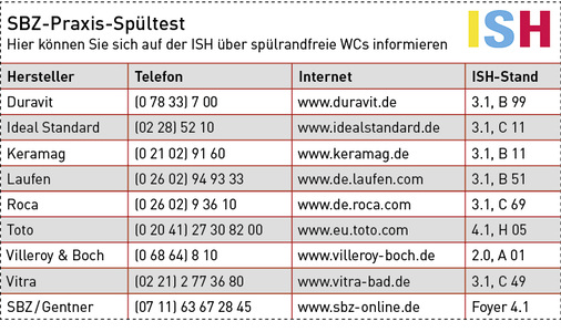 Beim SBZ-Spültest fällt zunächst auf, dass die Ergebnisse in der Gesamtbewertung und in den Einzeltests bzgl. Punktewertung sehr dicht beieinander liegen und nur geringe Unterschiede erkennen lassen. Betrachtet man ausschließlich die Ergebnisse der in Anlehnung an DIN EN 997 durchgeführten Tests, die dem Installateur im Zweifelsfall als sicheres Kriterium dienen, so belegt die Marke Villeroy & Boch einen Spitzenplatz.