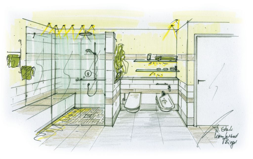 Zudem sollte neben der Beratung in der Ausstellung immer ein Besuch vor Ort erfolgen. Wichtig ist hier, die technischen Gegebenheiten zu erfahren, auch über den eigentlichen Raum hinaus. Häufig steht der Anspruch auf ein rollstuhlgerechtes Bad im Vordergrund, der nach Besichtigung vor Ort aber schnell über Bord geworfen wird. Um ein Bad mit einem Rollstuhl nutzen zu können, müssen auch die Wege dorthin entsprechend gestaltet sein. Wenn die Bauherren sich dessen bewusst werden, ist der Weg frei für die sinnvolle Planung eines Komfortbades.