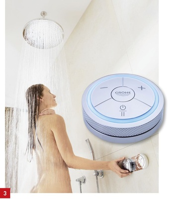 Morgens unter Zeitdruck soll das Duschen also die Funktion der schnellen Reinigung und des Wachmachens übernehmen. Manch einer mag schlaftrunken in die Dusche wanken und will alles funktional, übersichtlich und einfach in der Handhabung vorfinden. Das schließt sowohl die Bedienbarkeit der Duschtür als auch der Armatur ein. Ideal ist, wenn die Bedienbarkeit der Armatur ein Stehen im Trockenen ermöglicht – besonders bei Kombinationen mit Handbrause und Regenteller schützt dies den Benutzer vor einer unerwarteten Dusche von oben. Verbrühschutz und voreinstellbare Temperatur erleichtern es nicht nur dem Morgenmuffel möglichst schnell unter das erfrischende Nass von oben treten zu können. Grohe hat sich diesem Thema mit dem Digital Controller (Bild 3) gewidmet: Controller und Umsteller können ganz nach persönlichen Vorlieben und räumlichen Gegebenheiten überall im Bad losgelöst von der Armatur positioniert werden. Ob auf den Fliesen, der Keramik von Wanne und Waschtisch oder auf Badmöbeln und Konsolen – der individuellen Badgestaltung sind keine Grenzen gesetzt.