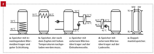 Doppelmantelspeicher: Bei gleichzeitiger Solareinspeisung, Einbindung weiterer Energieerzeuger oder hohen thermischen Abgabeleistungen der Wärmepumpe bieten sich auch Doppelmantelspeicher mit Bereitschaftsteil für Trinkwarmwasser an ( Bild 2e ). Zu beachten ist hier wieder die Gefahr der Vermischung der Temperaturniveaus für Heizung und Trinkwassererwärmung.