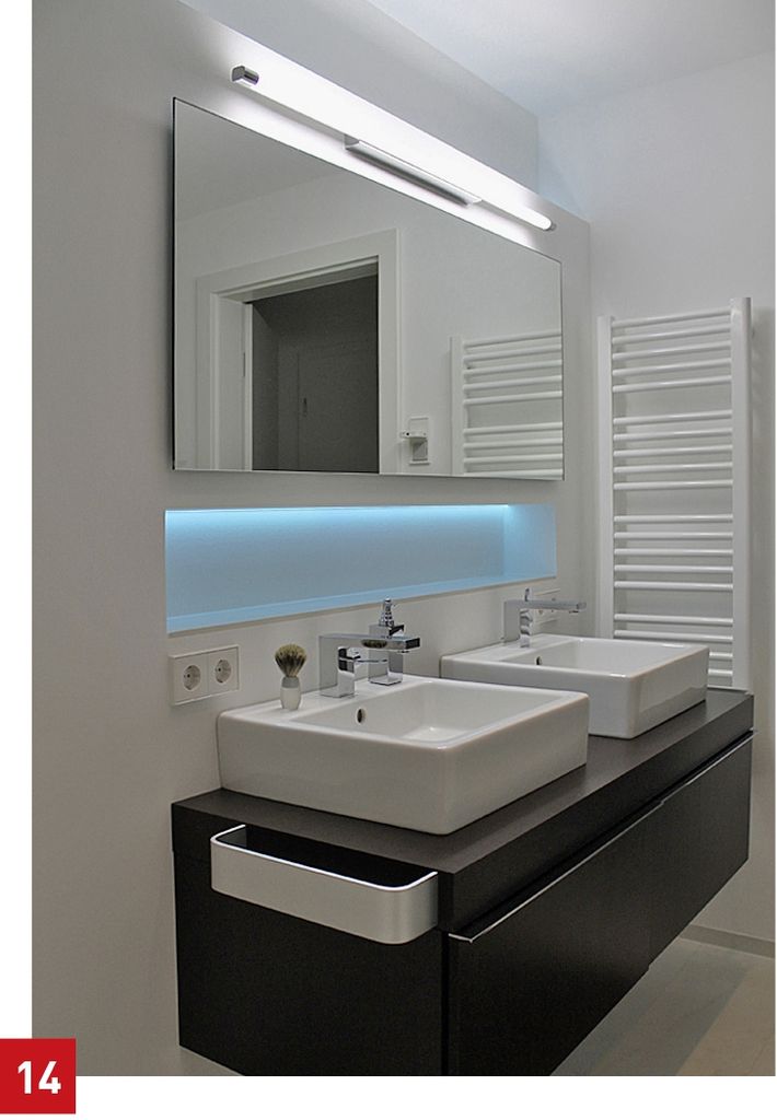 In der Nische unterhalb des Spiegels sowie in der abgesetzten Voute hinter dem Spiegel befinden sich RGB-LED-Bänder, die über Pulsweitenmodulation gesteuert werden können, um je nach Wunsch des Kunden eine andere Lichtfarbe zu realisieren, siehe auch Bild 13 und Bild 14 . Auch über der gemauerten Trennwand zwischen Badewanne und Toilette wurde ein indirekt an die Decke strahlendes farbiges LED-Band eingesetzt.