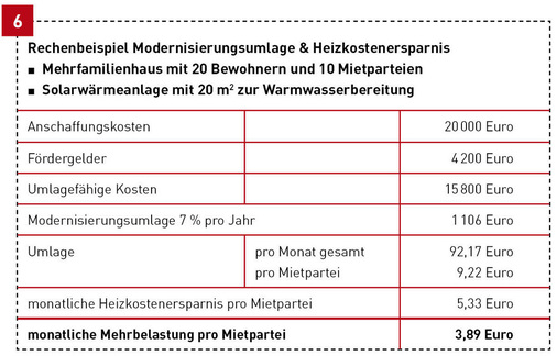 Bei unserem Zahlenbeispiel (Bild 5 ) übertrifft die Heizkostenersparnis nach 7 Jahren die Mehrbelastung durch die Modernisierungsumlage. Als Umlage auf die Kaltmiete wurden 5 % der Anschaffungskosten veranschlagt. Zugrunde gelegt wurde eine Solarwärmeanlage mit 20 m 2 Kollektorfläche zur Warmwasserbereitung zu einem Preis von 18000 Euro (nach Fördersummenabzug 16920 Euro).