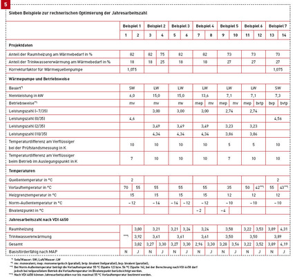 Möglich sind bei der Berechnung also zwei Jahresarbeitszahlen: Bei dem berechne-ten Bivalenzpunkt von –2 °C (hierbei wurden ein Trinkwarmwasserbedarf von 200 l/Tag und Sperrzeiten berücksichtigt) wäre die Anlage mit einer Jahresarbeitszahl von 2,96 nicht mehr förderfähig. Wählt man als Ausgangspunkt jedoch den Leistungsanteil, muss kein Heizstab berücksichtigt werden und die Jahresarbeitszahl beträgt wie oben 3,3 (Bild 5, Spalte 8).