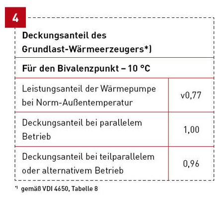 Gesetzt den Fall, die Wärmepumpe kann gar nicht monovalent betrieben werden, sondern benötigt einen weiteren Energieerzeuger, ergeben sich bei der Bestimmung des Anteils des zweiten Energieerzeugers nach Tabelle 8 der VDI 4650 (einen Ausschnitt zeigt Bild 4) verblüffende Interpretationsstrategien. Denn man kann entweder den Bivalenzpunkt bestimmen und den Deckungsanteil in der Tabelle ablesen oder vom Leistungsanteil der Wärmepumpe bei Norm-Außentemperatur ausgehen. DIN V 4701-10 6) enthält eine ähnliche Tabelle. Dort muss jedoch immer der ungünstigste Fall verwendet werden. In VDI 4650-1 fehlt diese Klausel.