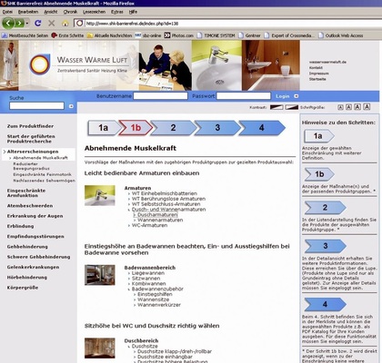 In der Datenbank https://www.shk-barrierefrei.de/ können Sie nach Produkten und Krankheitsbildern recherchieren. Dabei werden die Produkte nach Krankheitsbildern sortiert und das Fortschreiten der Alterserscheinungen und Krankheiten mit eingeplant. Je nach körperlichem Defizit werden Produkte vorgeschlagen, die diese Einschränkung kompensieren.