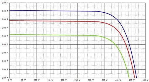 Anhand der U-I-Kurve kann man typische Fehler klassifizieren. In den Diagrammen werden die mit Tri-Ka gemessenen Kennlinien grün dargestellt. Rot verdeutlicht die gemessene Kennlinie, die auf Standard-Test-Bedingungen (STC) umgerechnet wurde. Blau ist die STC-Kennlinie des Modulherstellers.