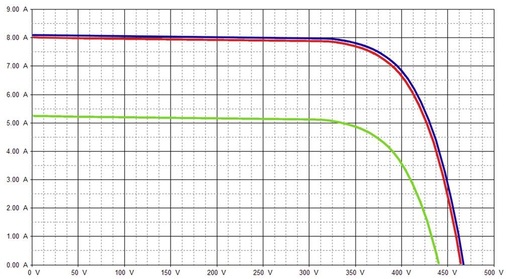 Das rechte Bild zeigt ein optimales Messergebnis. Der Verlauf der gemessenen (grün) und auf STC berechneten Kennlinie (rot) sowie der STC-Kennlinie des Modulherstellers (blau) sind beinahe deckungsgleich – kein Fehler vorhanden.