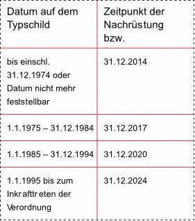 Werden die Grenzwerte nicht eingehalten, sollen diese Anlagen entweder mit einer bauartzugelassenen Filtereinrichtung nachgerüstet oder außer Betrieb genommen werden. Dazu gibt es einen weitreichenden Zeitplan: