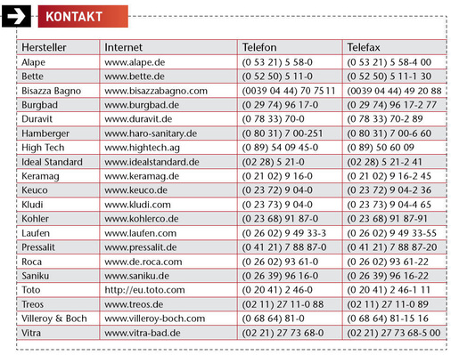 Nicht berücksichtigt in dieser Neuheiten-Show rund um den Waschplatz haben wir die 17 zur ISH neu präsentierten Badkollektionen, die wir in unserer Marktübersicht in der SBZ 5/2011 bereits vorgestellt haben. Weitere Infos hierzu gibt es, wenn Sie einmal umblättern.