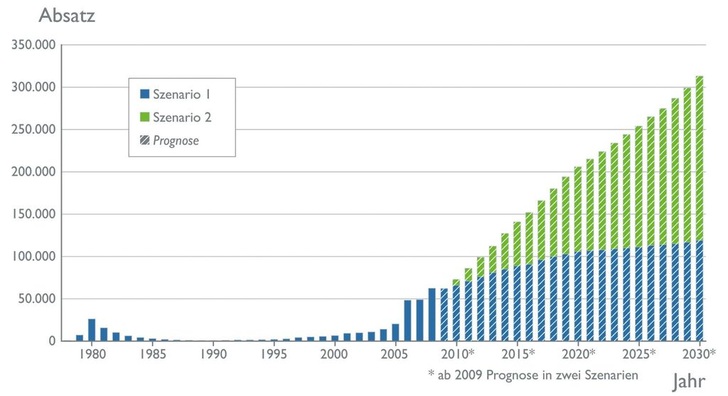 Beide Szenarien gehen ab 2010 von einem stetig steigenden Absatz aus. Szenario 1 mit nahezu unveränderter politischer Lage sagt einem Zuwachs von 90 % auf rund 120000 Einheiten (Zubau) in 2030 voraus; in allen Gebäuden zusammen befinden sich dann 2,1 Mio. Wärmepumpen. Unter günstigeren Bedingungen – etwa einem starken Marktanreizprogramm, einer deutlich beschleunigten Heizungsmodernisierung und Steuererleichterungen für erneuerbare Wärme (siehe unten) – prognostiziert das zweite Szenario den signifikant höheren Wert von rund 311000 verkauften Wärmepumpen für das Jahr 2030. Damit käme es zu einem Anstieg des Wärmepumpen-Absatzes von 390 % innerhalb der nächsten 20 Jahre, der Wärmepumpenbestand würde dadurch unter Berücksichtigung des Rückbaus auf fast 4 Mio. Systeme bis 2030 steigen. 23 % der in Benutzung befindlichen Wärmeerzeuger wären dann Wärmepumpen (aktuell gibt es laut BDH etwa 17 Mio. Wärmeerzeuger im Markt).