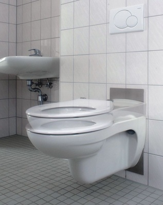 Höhe des WC-Beckens: Bezogen auf die Oberkante WC-Sitz wird das WC-Becken für die Rollstuhlnutzer auf einer Höhe von mindestens 46 cm und höchstens 48 cm montiert. Dies ist bei der Installation zu berücksichtigen und die Elemente sind entsprechend einzustellen. Auch im privaten Wohnungsbau werden sehr häufig individuelle Höhen definiert und in der Rohinstallation auf die Nutzeranforderungen eingestellt. Nutzerabhängig kann eine variable Höhenverstellung erforderlich sein. Zum Beispiel in stationären Kranken- oder Pflegeeinrichtungen. Dazu stehen komplette vollautomatische Anlagen, die vor der Wand montiert werden, zur Verfügung oder in die Wand eingebaute WC-Elemente, die nachträglich in der Höhe verstellt werden können.
