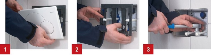 1. Nach dem Lösen der Befestigungsschrauben an der WC-Keramik die Betätigungsplatte demontieren.