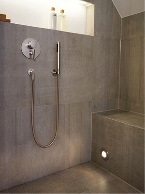 In der Dusche (Bild 6) können nun die Armaturen und Brausen entweder losgelöst von den senkrechten Fugen platziert werden, um sich auf das Fugenraster des Bodens zu beziehen – was man aber, ehrlich gesagt, nur in der Grundrissdarstellung wahrnimmt – oder umgekehrt losgelöst vom Bodenfugenraster auf das Wandfugenraster. Dieser Bezug wird vom Betrachter im Raum wahrgenommen und strahlt Ruhe aus.