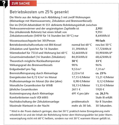 Im Gegensatz zum Ein- und Zweifamilienhaus ist für Mehrfamilienhäuser aus Komfortgründen die Trinkwasserzirkulation über 16 Stunden vorgesehen, aber nicht vorgeschrieben. Die neue Anforderung der DIN 1988 Teil 200 nach Temperaturpräsenz innerhalb von 30 Sekunden ist allerdings nicht ohne Zirkulation zu erfüllen. Um den Komfort für die Nutzer zu sichern, die sich eine Temperaturpräsenz schon 15 Sekunden nach dem Öffnen der Zapfstelle wünschen, und um jedes Hygienerisiko ausschließen zu können, ist in der Kleinanlage nach Bild 3 auch eine Zirkulationspumpe zur Zirkulation der Ringleitung bei 50 °C vorgesehen. Natürlich wird der Betreiber einer solchen Kleinanlage, besonders bei einem Mehrfamilienhaus, alle drei Jahre das Wasser stichprobenartig auf Legionellen prüfen lassen. Eine Prüfpflicht mit Strafandrohung bei Unterlassung gibt es in diesem Falle aber nicht. Die Kosten- und Energieeinsparung ist so groß, dass es sich auch bei der Sanierung im Wohnungsbau lohnt, die Möglichkeiten einer Kleinanlage mit Ringleitung zu überprüfen.