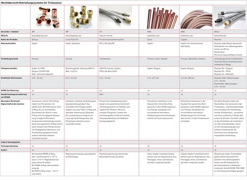 Pressen. Stecken. Löten. Schweißen. Schieben. Klemmen: Dies sind die momentan am Markt, mehr oder weniger, verbreiteten Verbindungstechniken für Trinkwasserversorgungssysteme in der Gebäudetechnik. Teilweise sind die Verbindungstechniken sogar in verschiedenen Ausprägungen erhältlich. Pressfittings gibt es beispielsweise in axialer, radialer und in raxialer Ausführung. Groß ist auch die Bandbreite der Fittingwerkstoffe, die sich grundsätzlich in Kunststoff und Metall einordnen lassen. PPSU, PVDF, Kupfer, Edelstahl, Rotguss bis hin zu bleifreier Siliziumbronze; das ist nur eine kleine Auswahl. Genauso groß ist das Angebot an Rohrwerkstoffen, die mit den unterschiedlichen Verbindungstechniken verbunden werden können. Unter anderem kann zwischen den Materialien Kupfer, Edelstahl, Mehrschichtverbundrohren, PEX-Rohren und PB-Rohren gewählt werden. Daneben sind Vollkunststoffrohrleitungen (PP-R) erhältlich.