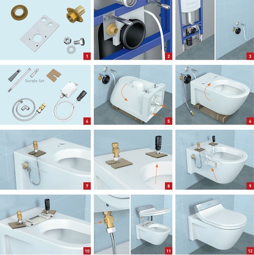 4 + 5 Zum Lieferumfang des WCs gehören die passende Durafix-Schnellbefestigung, die Montagehilfe aus Kartonage, das Anschluss-Set mit allen wichtigen Anschlusskomponenten und eine Montageanleitung. Auf der Kartonage wird das Wand-WC verkehrt herum platziert.