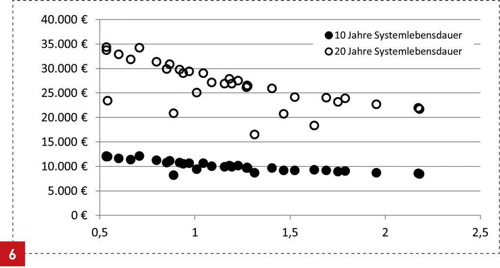 Systeme mit einer Lebensdauer von 10 Jahren erwirtschaften hingegen lediglich einen abgezinsten Ertrag von etwa 10000 Euro. Geht man von einem Anlagepreis von 1500 Euro pro kWp aus, so verbleiben vom Ertrag noch 2500 Euro, die für die Deckung der Solarstromspeicherkosten zur Verfügung stehen, d.h. die Systeme müssen weniger als 2500 Euro kosten, damit die Investition noch vorteilhaft ist.