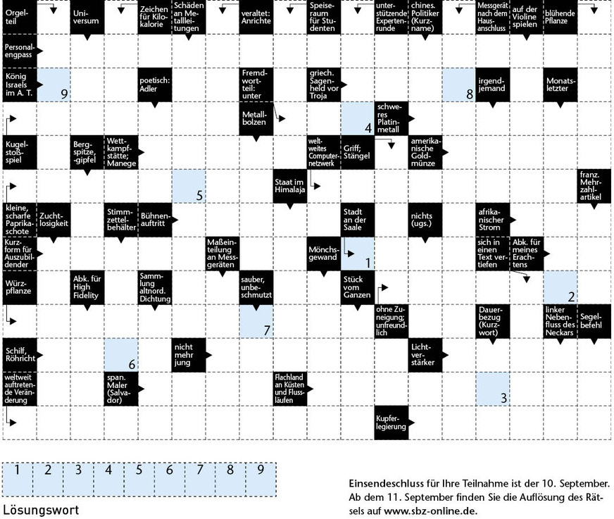 Schicken Sie das Lösungswort mit Ihrer Adresse an kreuzwort@sbz-online.de. Unter den richtigen Einsendungen verlosen wir drei SBZ-Zangengott-Mützen. Die Gewinner werden auf www.sbz-online.de bekannt gegeben!