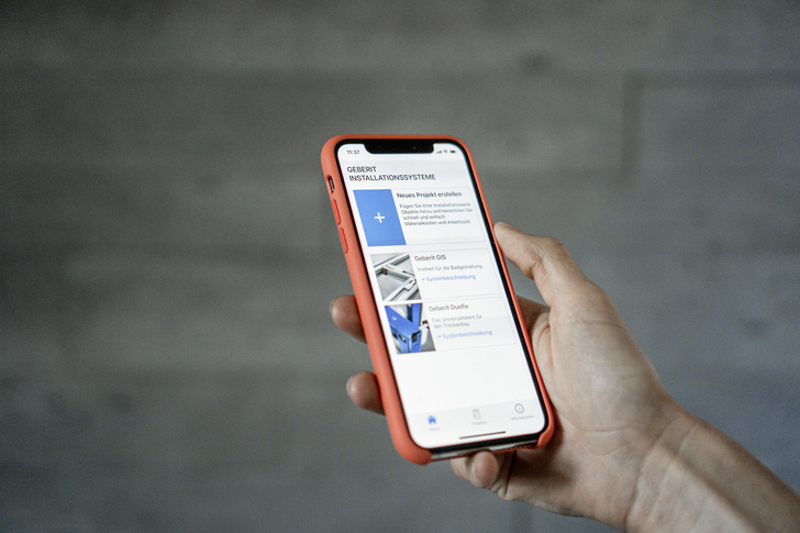 Mit der App „Geberit Installationssysteme“ (iOS und Android) können Materialbedarf und geschätzte Kosten von Installationswänden direkt auf der Baustelle berechnet werden. Der Nutzer wählt eine Installationswand Geberit GIS oder Duofix aus, fügt die benötigten Sanitärobjekte hinzu und konfiguriert diese. So wird in wenigen Schritten eine Materialliste erstellt, die Installationswand visualisiert und eine Kostenschätzung erstellt. Die Vorwandinstallation kann teilhoch oder raumhoch, einseitig oder beidseitig beplankt sowie in einer beliebigen Kombination dieser Eigenschaften per Icon ausgewählt werden. Möglich ist zudem die Konfiguration als Raumteiler. Auch Höhe, Breite, Tiefe sowie Fußbodenaufbau lassen sich festlegen. Über die PDF-Funktion lässt sich das Datenblatt zur Installationswand mit detaillierter Materialliste und Installationszeichnung aus der App heraus versenden.