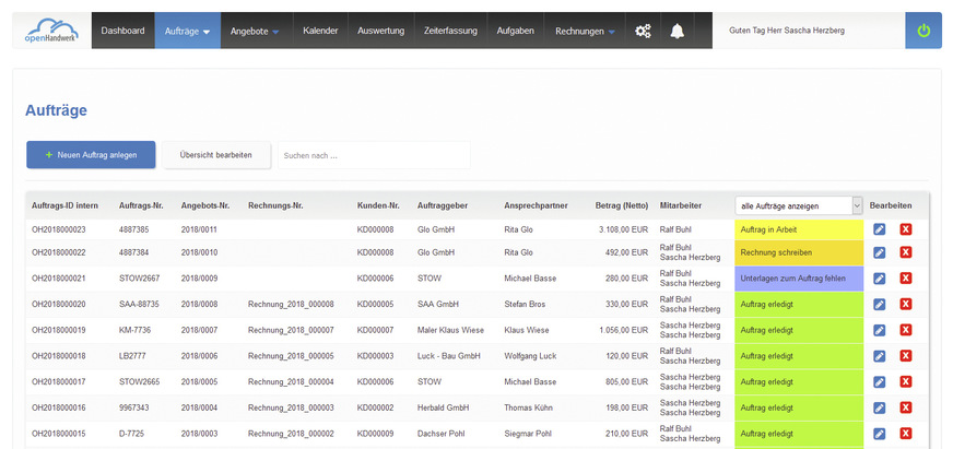 Anfangs wurde openHandwerk als Prozess-Software in der Cloud vor die On-Premise-Branchenlösung geschaltet. Aufträge und Angebote wurden in openHandwerk angelegt, dokumentiert, Zeiten auf Projekte gebucht, Mitarbeiter terminiert und die komplette Kommunikation über die Baustellen-App mit integriertem Messenger durchgeführt. Das Rechnungswesen verblieb zu Beginn bei der alten Handwerkersoftware in Festinstallation. Rechnungen und Angebote wurden in openHandwerk hochgeladen, um die Aufträge umfangreich zu dokumentieren.