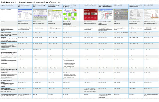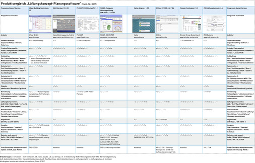Sowohl die Konzeption als auch der Funktionsumfang der Lösungen ist sehr unterschiedlich: Die Palette reicht von kostenfreien herstellerspezifischen Planungs- und Ausschreibungsprogrammen von Lüftungssystem-Herstellern wie Helios, Maico oder Zehnder, bis hin zu kostenpflichtigen herstellerunabhängigen Planungsprogrammen als eigenständige Software oder als modularer Teil von EnEV- oder TGA-Softwarelösungen.