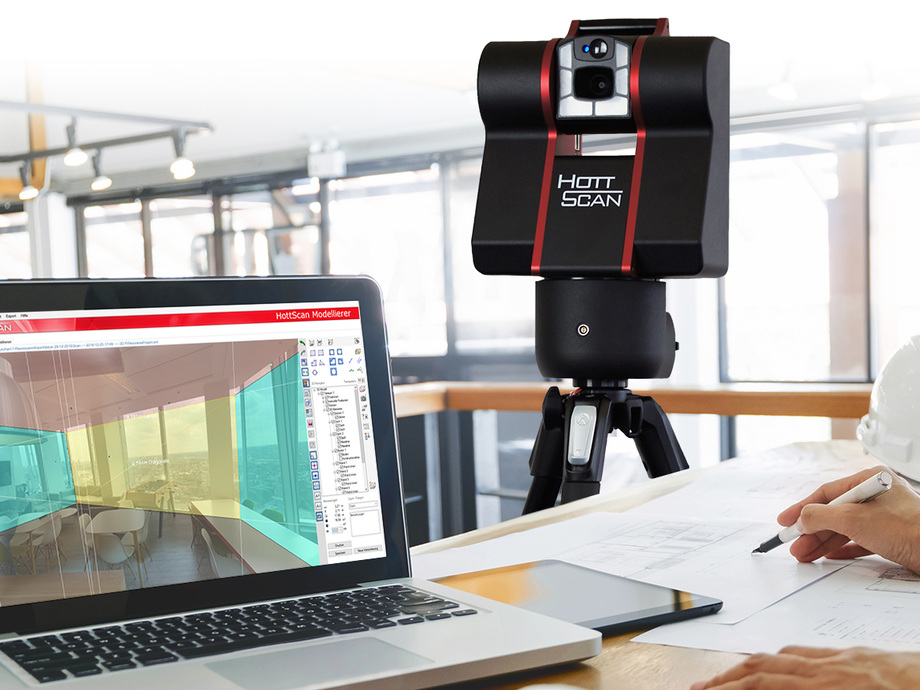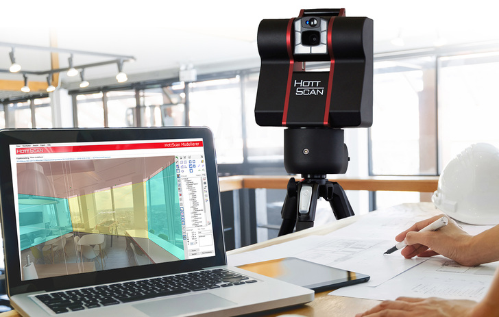 Die fachgemäße Erfassung von Räumen und Gebäuden zur Erstellung eines Aufmaßes erfolgt am effektivsten über 3D-Laserscanning. Der 3D-Raumscanner „HottScan HS-1" erfasst – trotz Inventar oder versteckter Winkel – in weniger als zwei Minuten den kompletten Raum und erzeugt mithilfe innovativer Photogrammetrie praxisgerecht und präzise das Aufmaß. Der auf einem – im Lieferumfang enthaltenen – Stativ befestigte, vertikal rotierende Laserscanner dreht sich horizontal um die eigene Achse. Während einer 360°-Umdrehung tastet er die Raumsituation vollständig ab und speichert die Geometriedaten in Form von räumlichen Koordinatenwerten. Dabei werden nicht nur markante Objektpunkte gemessen, sondern die gesamte Umgebung rasterförmig abgetastet und dreidimensional erfasst.