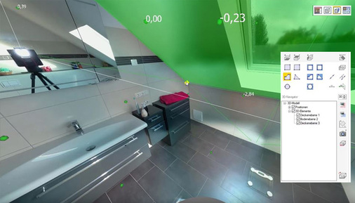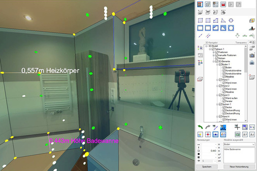 Es werden keine Millionen Punkte in Form einer Punktwolke benötigt, sondern lediglich 50 bis 60 Referenzpunkte erzeugt. Diese Parameter sind vollkommen ausreichend, um in kurzer Zeit einen 3D-Raum zu generieren. Bei Bedarf können mit der bimCAD App oder Modellierer Software weitere Messpunkte gewonnen werden.