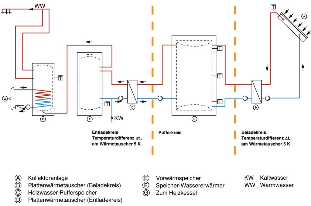 - Entladekreis: Vor den Speicher-Wassererwärmer (F) ist ein Vorwärmspeicher (E) geschaltet, in den das Trinkwasser eintritt. In diesem Vorwärmspeicher werden die Schwankungen des Warmwasserverbrauchs gepuffert. Abhängig von der Temperaturdifferenz zwischen Puffer- und Vorwärmspeicher, wird die solare Wärme über den Plattenwärmetauscher (D) auf das Trinkwasser im Vorwärmspeicher übertragen. Steht nicht genügend solare Wärme zur Verfügung, kann das Trinkwasser im Speicher-Wassererwärmer über einen zentralen Wärmeerzeuger (G) nachgeheizt werden.