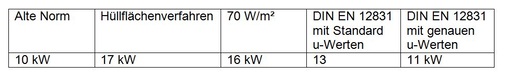Die Berechnung mit standardisierten u-Werten nach Baualtersklasse liegt mit 13 kW schon deutlich besser. Ich hatte die Werte meines Gebäudes zum Teil noch dokumentiert und konnte schlussendlich bei 11 kW landen. Das ist eine erstaunliche Übereinstimmung zwischen alter Norm und aktueller Norm, zumal die Ergebnisse durch einen veränderten Rechengang nicht deckungsgleich sein können.