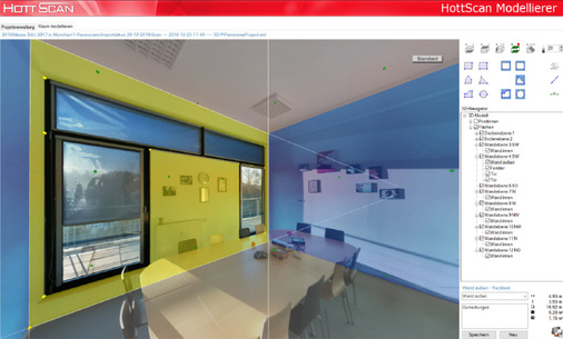 Unter anderem kann das Tool auch bei der Berechnung von Raumkanten unterstützen - sogar die, die hinter Bauteilen verborgen liegen. Kein Maß wird dadurch in Zukunft verloren gehen. Aus den Messwerten werden mit Hilfe von Ebenen und Flächen zügig vollständige 3D-Räume modelliert. Sobald die Boden- und Deckenflächen konstruiert sind, werden fehlende Bauteile auf Knopfdruck ergänzt. Komplette Gebäude und einzelne Gebäudeebenen können für weiterführende Planungen mittels der Software HottScan Projects generiert werden.