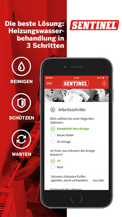 - Die App ermittelt das passende Sentinel-Produkt und die richtige Dosierung – ausgehend von Daten wie Größe der Anlage, Leistung des Brenners sowie Härtegrad des Wassers.