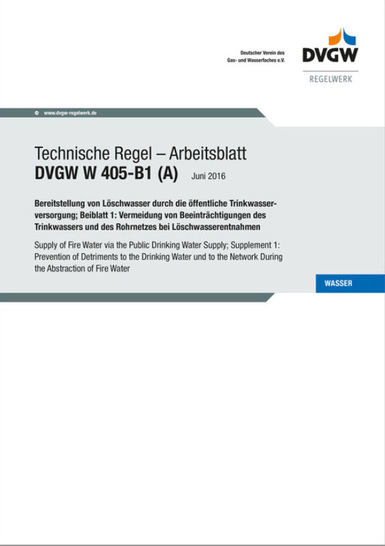 Seit Juni 2016 liegt das neue Arbeitsblatt W 405-B1 (A) „Bereitstellung von Löschwasser durch die öffentliche Trinkwasserversorgung“ des Deutschen Vereins des Gas- und Wasserfaches (DVGW) vor. Das Beiblatt soll Verschmutzungen des Trinkwassers oder Beeinträchtigungen der Trinkwasserversorgung bei der eigentlichen Löschwasserentnahme verhindern. Es übernimmt bzw. konkretisiert Anforderungen und Hinweise verschiedener anderer Regelwerke, die sich nicht notwendigerweise ausdrücklich oder ausschließlich auf Löschwasserentnahmen beziehen. Ferner benennt es daraus abgeleitet wesentliche Elemente einer optimalen Ausstattung, so dass Fehlbedienungen bzw. daraus resultierende mögliche Beeinträchtigungen von Trinkwasser und Rohrnetz schon im Ansatz minimiert werden.