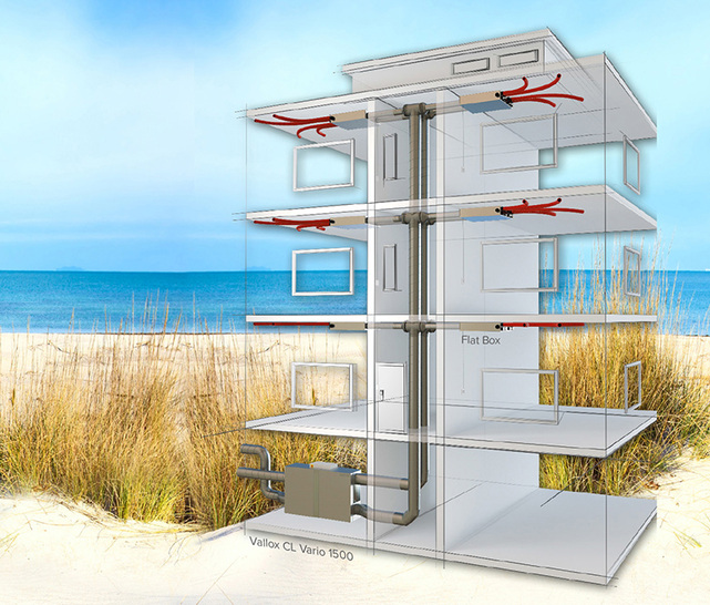 Für die optimale Luftversorgung kombinieren Sie die Geräte mit der Flat Box von Vallox, und Sie erhalten alle Vorteile eines zentralen Wohnungslüftungssystems plus geringem Platzbedarf und Wartungsaufwand.