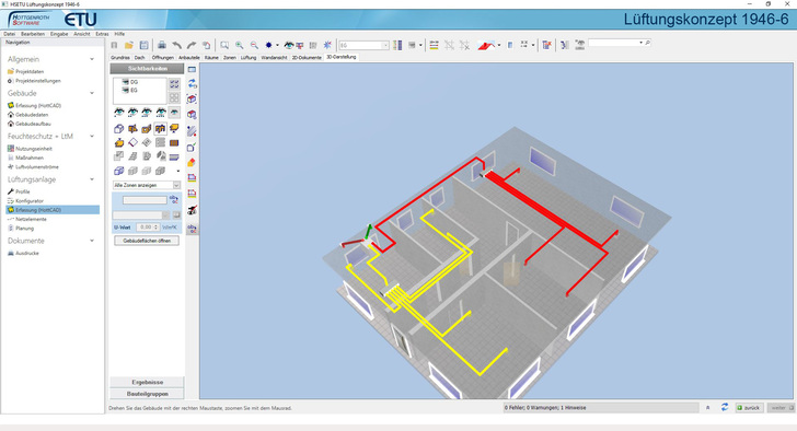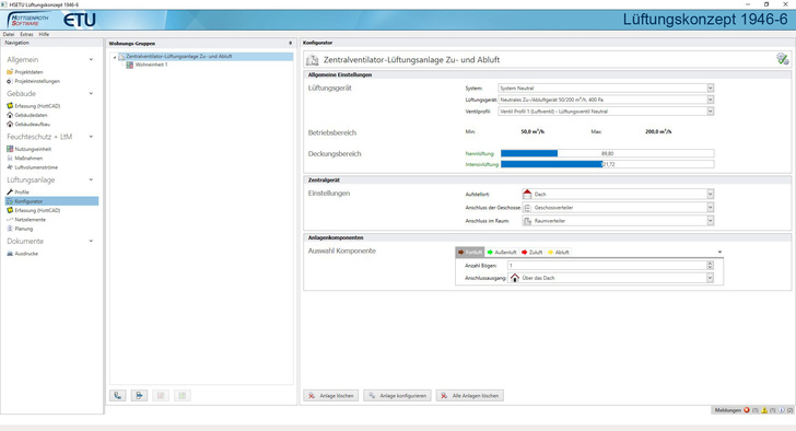 Mit den aktuellen Versionen der Programme ‚ Lüftungskonzept 1946-6 ‘ und ‚ Lüftungsplaner 3D ‘ setzt Hottgenroth/ETU neue Maßstäbe zur Berechnung und Auslegung von Wohnungslüftungsanlagen zu einem guten Preis-Leistungsverhältnis. Vom reinen, normkonformen Lüftungskonzept über schnelle Vorschläge für mögliche Anlagenkonfigurationen inkl. Stücklisten bis hin zur 3D-Darstellung der Lüftungsanlagen wird BIM-konform geplant und berechnet. Vorbereitungen zur Umsetzung der nahenden neuen DIN 1946-6 wurden von Entwicklerseite bereits getroffen, damit im Änderungsfall keine Verzögerungen auftreten.