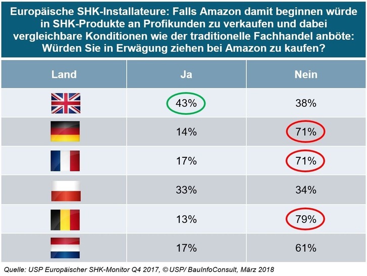 So wurden die SHK-Installateure zu einem bewusst zugespitzten Gedankenspiel aufgefordert: Würden sie bei Amazon Material für ihre Arbeit kaufen, wenn diese dort zu ähnlichen Konditionen wie im althergebrachten Fachhandel erhältlich wären? Mehr als 70 Prozent der befragten SHK-Handwerker in den allermeisten Ländern erschien dies abwegig – vor allem in Deutschland, Frankreich und den Beneluxstaaten.