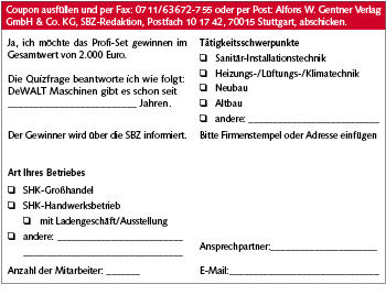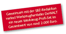 Um an dem Gewinnspiel teilzunehmen müssen Sie nur den Coupon ausgefüllt zurückschicken und die Frage beantworten, wie lange es schon DeWALT-Maschinen gibt. Hilfestellungen für die Beantwortung dieser Frage finden Sie auf der Web-Site des Werkzeugherstellers. Mit etwas Glück kann das Profi-Set schon bald Ihnen gehören. Unter allen Einsendern wird die Redaktion gemeinsam mit DeWALT den Gewinner auslosen und den Namen in der SBZ veröffentlichen.