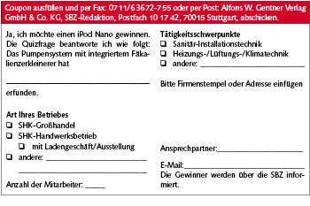 Als Dank an das verarbeitende Handwerk, das diesen Erfolg erst ermöglichte, verlost Sanibroy nun gemeinsam und exklusiv mit den Fachmagazinen SBZ, SBZ-Monteur und RAS jetzt 30 iPods Nano mit 2 GB Speicher. Sie müssen nur den Coupon ausgefüllt zurückschicken und die Frage beantworten, wer die Kleinhebeanlage erfunden hat. Dann kann einer der iPods schon bald Ihnen gehören. Unter allen Einsendern wird die Redaktion gemeinsam mit Sanibroy 30 Gewinner auslosen. Eine Liste der Gewinner wird in der SBZ veröffentlicht.