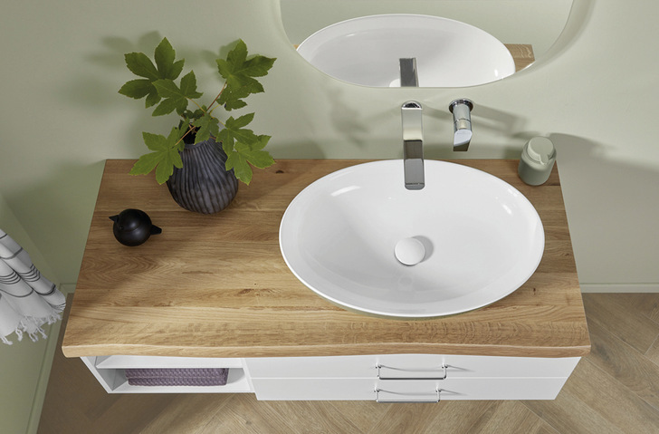 Bei der modularen Systemserie „2morrow“ von Villeroy & Boch handelt es sich um eine 40 mm starke Konsole aus massivem Eichenholz. Sie verbindet angenehme Haptik mit außergewöhnlicher Optik. Da Wuchs, Struktur, Farbnuancen und Verästelungen bei Eiche von Natur aus stark variieren können, besitzt jede Konsole ein ganz eigenes, unverkennbares Erscheinungsbild, das sie zum Unikat macht. An der Stirnseite sind die Vollholz-Lamellen, aus denen die Konsole zusammengefügt ist, zu sehen. Die Vorderkante ist der natürlichen Form eines Baumes nachempfunden und vertieft damit den exklusiven, authentischen Look weiter. Die Massivholz-Konsole gibt es in zwei Ausführungen: das warme Eiche hell erzeugt mit weißen, pastellfarben oder leicht erdigen Möbelfronten ein behagliches Flair, während das moderne Eiche steingrau sehr gut zu dunklen, anthrazitfarbenen oder schwarzen Fronten in einem puristischen Ambiente passt. Beide Varianten können mit unifarbenen Möbeln aus dem 2morrow-Sortiment eingesetzt werden. Mit Standardtiefe 520 mm passen sie zu gängigen Unterbauwaschtischen sowie zu Anbauschränken und Solitärmöbeln mit 340 mm und 510 mm Höhe. In der Breite ist die Konsole maßflexibel von 500 mm bis 2.290 mm und wird ab Werk passgenau gefertigt. Zudem sind optional individuelle Sondertiefen möglich. Wird eine Massivholz-Konsole freitragend montiert, sind die Befestigungswinkel sichtbar.