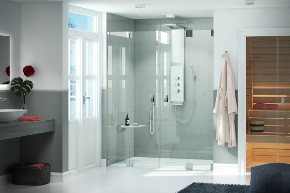 Dass ein großräumiges Bad mit großflächiger Dusche und angegliederter Sauna mit direktem Zugang zum Balkon in einer Altbauwohnung machbar ist, zeigt dieses Beispiel von Glassdouche.