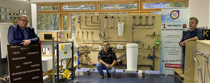 In der Ausbildung kommen praxisnahe Themen öfters zu kurz. Bei der Sanitärtechnik droht sich der Zustand noch zu verschärfen, wo jetzt Heizung allein den Takt vorgibt. Handwerksmeister Felix Zehrfeld (Bildmitte) hat mit Yves Wallusek eine Lehr- und Lern-Installationswand gebaut und einer Berufsschule gespendet. Dennis Jäger (SBZ) sagen sie, was sie sich davon erhoffen.